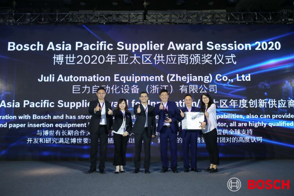 在《博世2020亞太區(qū)供應(yīng)商頒獎儀式》上,巨力自動化公司獨占鰲頭,從多供應(yīng)商中脫穎而出,獲得了此次博世集團頒布的亞太區(qū)供應(yīng)商《亞太區(qū)年度創(chuàng)新供應(yīng)商》獎項。